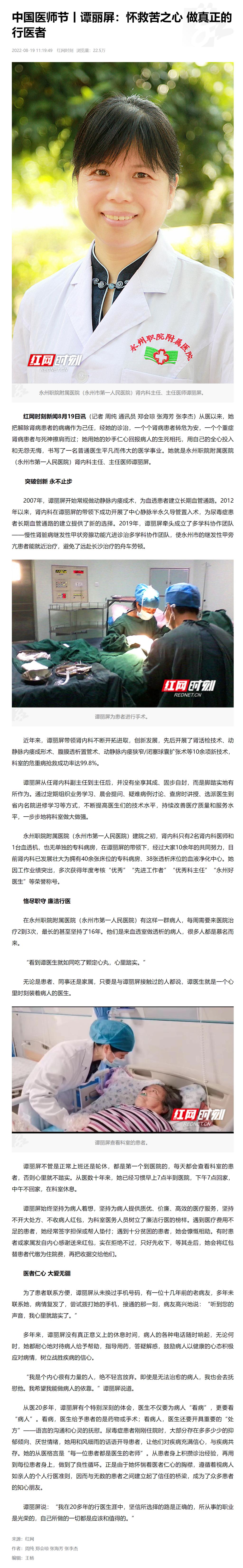 红网时刻新闻8月19日讯(记者 周纯 通讯员 郑会琼 张海芳 张李杰)从医以来,她把解除肾病患者的病痛作为己任,经她的诊治,一个个肾病患者转危为安,一个个重症肾病患者与死神擦肩而过;她用她的妙手仁心回报病人的生死相托,用自己的全心投入和无怨无悔,书写了一名普通医生平凡而伟大的医学事业。她就是永州职院附属医院(永州市第一人民医院)肾内科主任、主任医师谭丽屏。