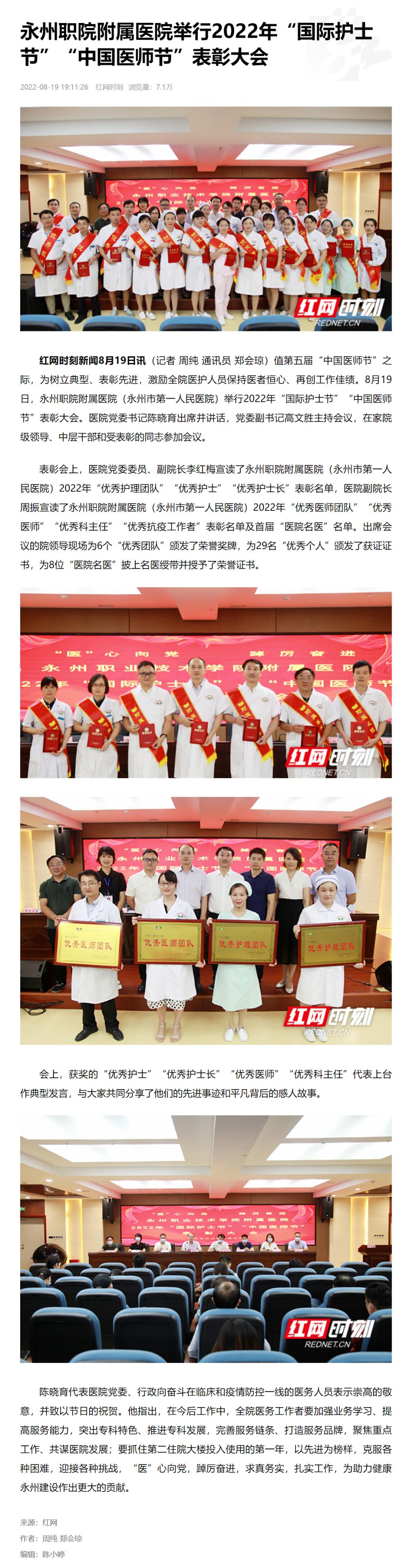 红网时刻新闻8月19日讯(记者 周纯 通讯员 郑会琼)值第五届“中国医师节”之际,为树立典型、表彰先进,激励全院医护人员保持医者恒心、再创工作佳绩。8月19日,永州职院附属医院(永州市第一人民医院)举行2022年“国际护士节”“中国医师节”表彰大会。医院党委书记陈晓育出席并讲话,党委副书记高文胜主持会议,在家院级领导、中层干部和受表彰的同志参加会议。