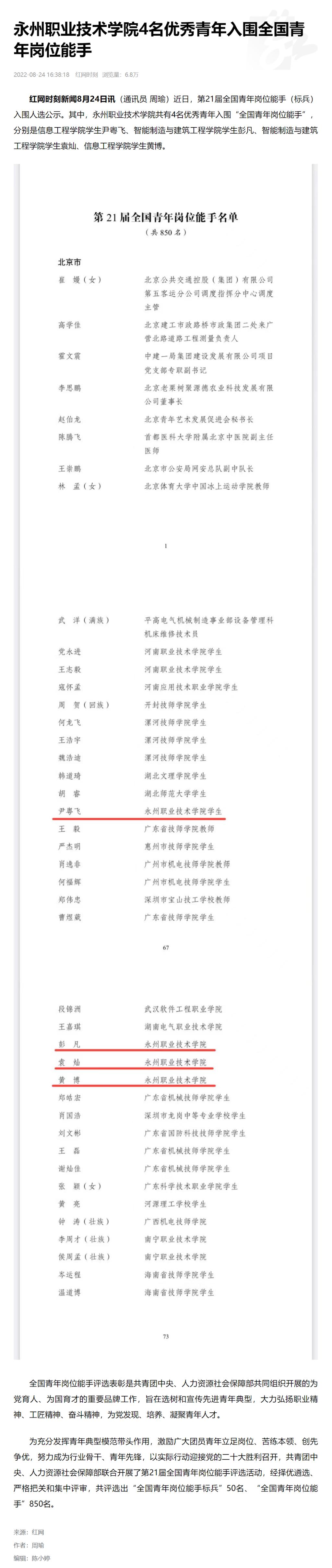 红网时刻新闻8月24日讯(通讯员 周瑜)近日,第21届全国青年岗位能手(标兵)入围人选公示。其中,永州职业技术学院共有4名优秀青年入围“全国青年岗位能手”,分别是信息工程学院学生尹粤飞、智能制造与建筑工程学院学生彭凡、智能制造与建筑工程学院学生袁灿、信息工程学院学生黄博。