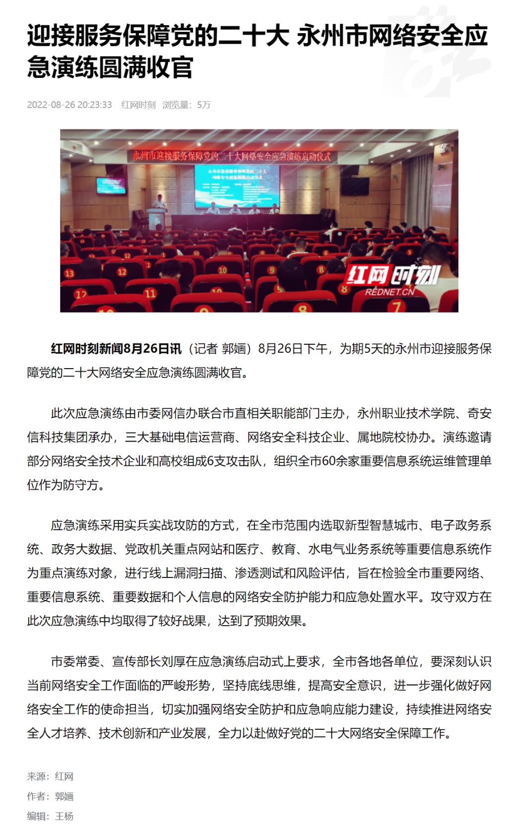 红网时刻新闻8月26日讯(记者 郭婳)8月26日下午,为期5天的永州市迎接服务保障党的二十大网络安全应急演练圆满收官。