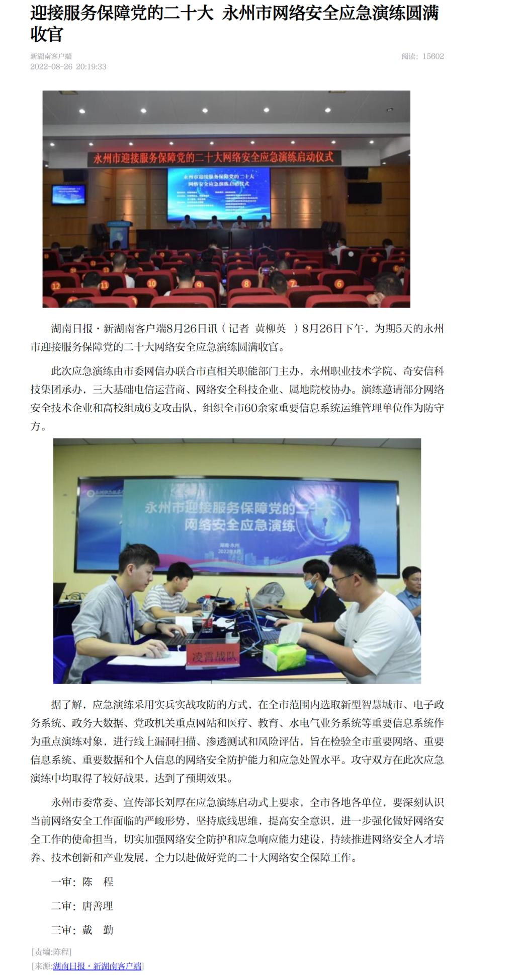 湖南日报·新湖南客户端8月26日讯(记者 黄柳英 )8月26日下午,为期5天的永州市迎接服务保障党的二十大网络安全应急演练圆满收官。
