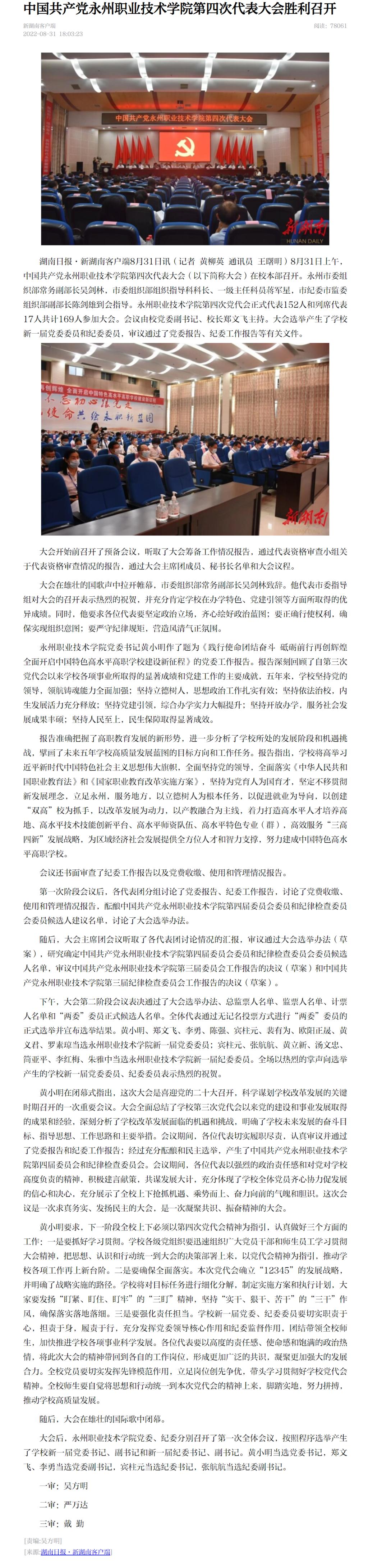 湖南日报·新湖南客户端8月31日讯(记者 黄柳英 通讯员 王曙明)8月31日上午,中国共产党永州职业技术学院第四次代表大会(以下简称大会)在校本部召开。永州市委组织部常务副部长吴剑林,市委组织部组织指导科科长、一级主任科员蒋军星,市纪委市监委组织部副部长陈剑雄到会指导。永州职业技术学院第四次党代会正式代表152人和列席代表17人共计169人参加大会。会议由校党委副书记、校长郑文飞主持。大会选举产生了学校新一届党委委员和纪委委员,审议通过了党委报告、纪委工作报告等有关文件。