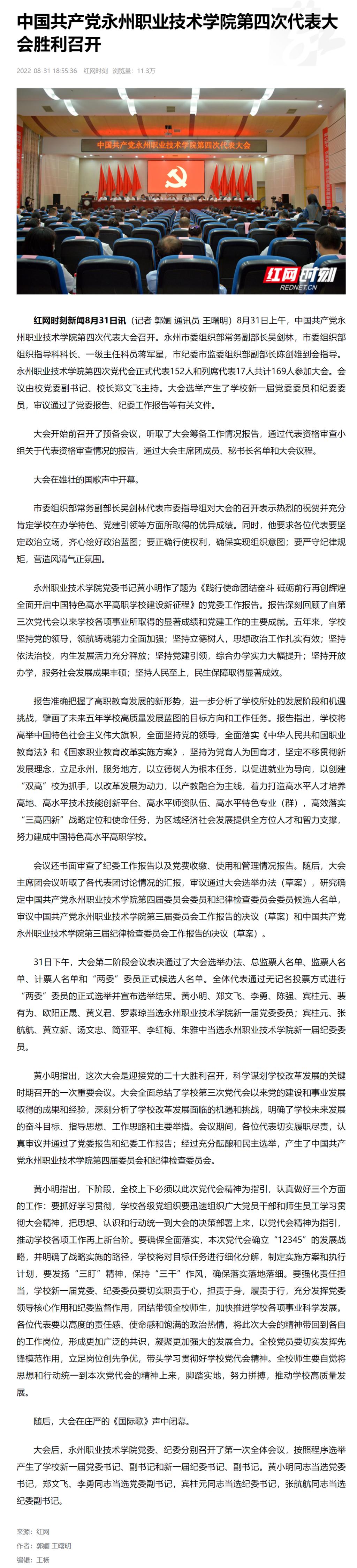 红网时刻新闻8月31日讯(记者 郭婳 通讯员 王曙明)8月31日上午,中国共产党永州职业技术学院第四次代表大会召开。永州市委组织部常务副部长吴剑林,市委组织部组织指导科科长、一级主任科员蒋军星,市纪委市监委组织部副部长陈剑雄到会指导。永州职业技术学院第四次党代会正式代表152人和列席代表17人共计169人参加大会。会议由校党委副书记、校长郑文飞主持。大会选举产生了学校新一届党委委员和纪委委员,审议通过了党委报告、纪委工作报告等有关文件。