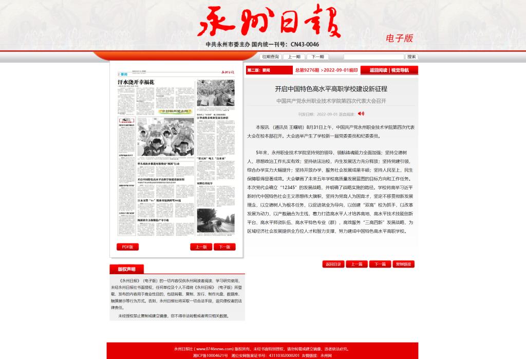 本报讯 (通讯员 王曙明)8月31日上午,中国共产党永州职业技术学院第四次代表大会在校本部召开。大会选举产生了学校新一届党委委员和纪委委员。