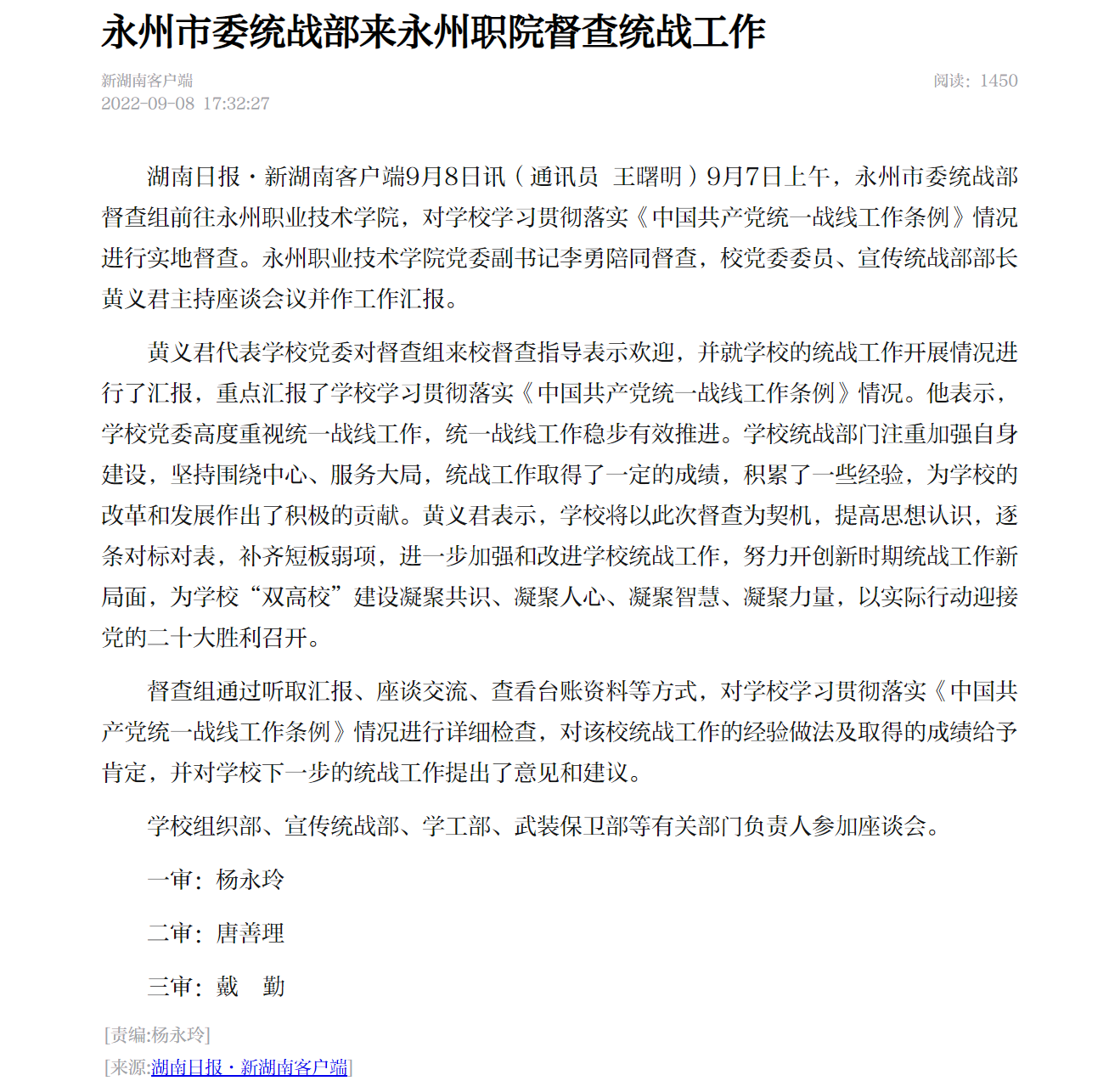 湖南日报·新湖南客户端9月8日讯(通讯员 王曙明)9月7日上午,永州市委统战部督查组前往永州职业技术学院,对学校学习贯彻落实《中国共产党统一战线工作条例》情况进行实地督查。永州职业技术学院党委副书记李勇陪同督查,校党委委员、宣传统战部部长黄义君主持座谈会议并作工作汇报。