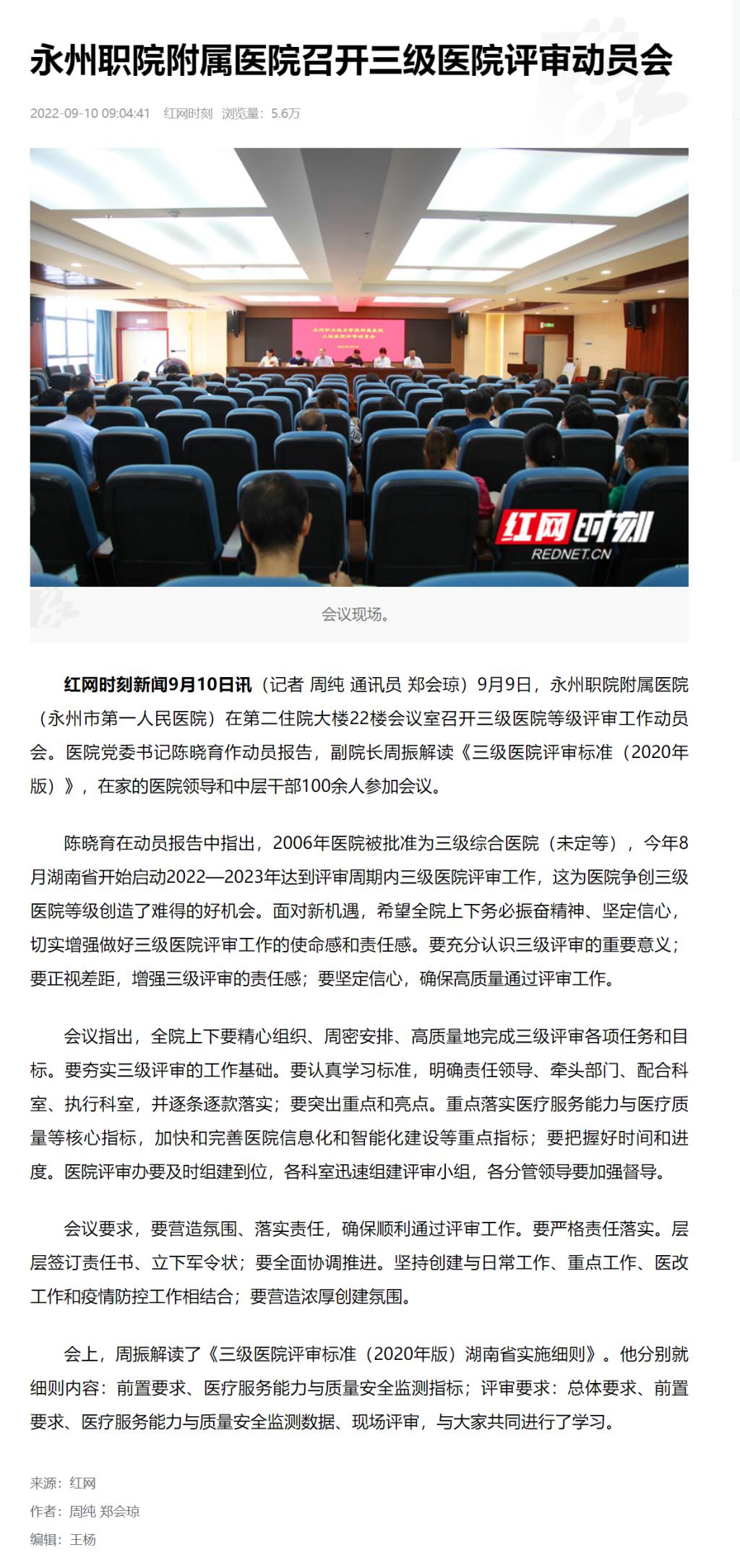 红网时刻新闻9月10日讯(记者 周纯 通讯员 郑会琼)9月9日,永州职院附属医院(永州市第一人民医院)在第二住院大楼22楼会议室召开三级医院等级评审工作动员会。医院党委书记陈晓育作动员报告,副院长周振解读《三级医院评审标准(2020年版)》,在家的医院领导和中层干部100余人参加会议。