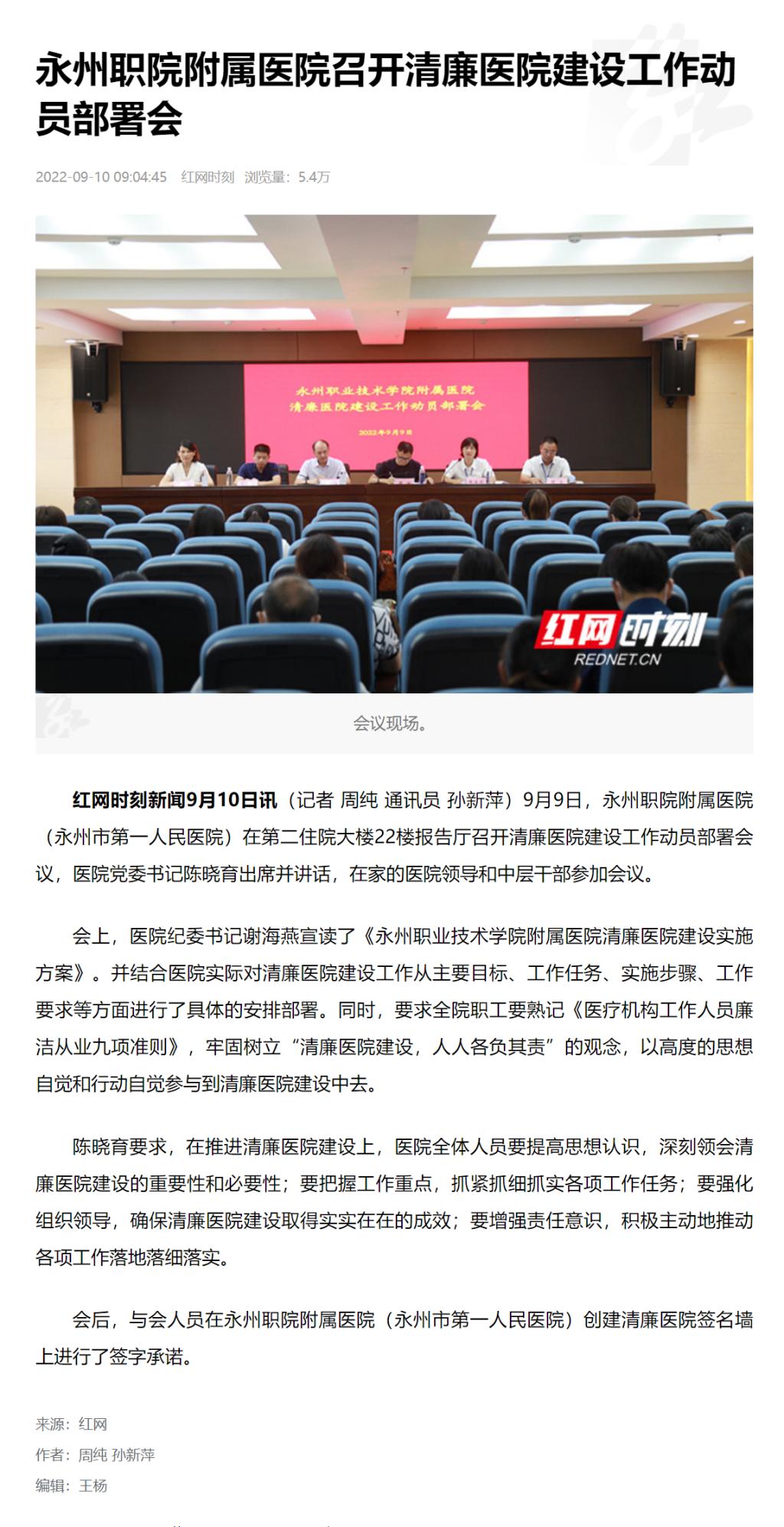 红网时刻新闻9月10日讯(记者 周纯 通讯员 孙新萍)9月9日,永州职院附属医院(永州市第一人民医院)在第二住院大楼22楼报告厅召开清廉医院建设工作动员部署会议,医院党委书记陈晓育出席并讲话,在家的医院领导和中层干部参加会议。