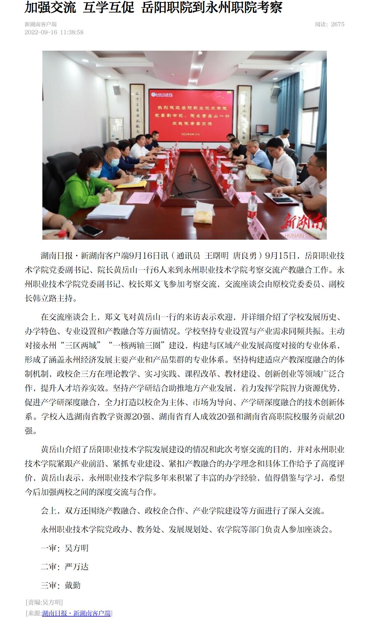 湖南日报·新湖南客户端9月16日讯(通讯员 王曙明 唐良勇)9月15日,岳阳职业技术学院党委副书记、院长黄岳山一行6人来到永州职业技术学院考察交流产教融合工作。永州职业技术学院党委副书记、校长郑文飞参加考察交流,交流座谈会由原校党委委员、副校长韩立路主持。