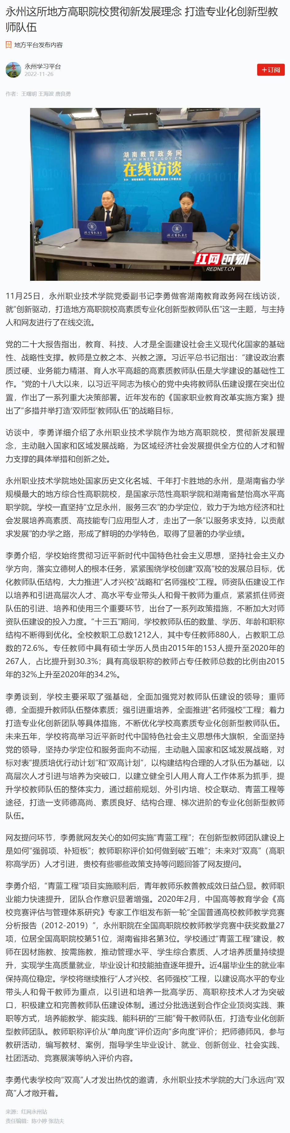 11月25日,永州职业技术学院党委副书记李勇做客湖南教育政务网在线访谈,就“创新驱动,打造地方高职院校高素质专业化创新型教师队伍”这一主题,与主持人和网友进行了在线交流。
