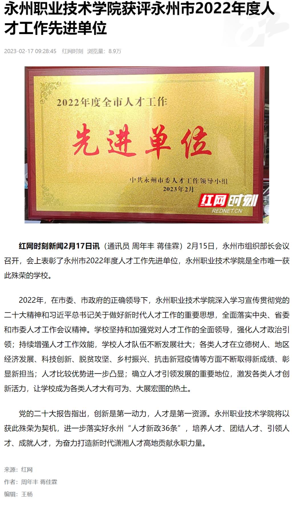 红网时刻新闻2月17日讯(通讯员 周年丰 蒋佳霖)2月15日,永州市组织部长会议召开,会上表彰了永州市2022年度人才工作先进单位,永州职业技术学院是全市唯一获此殊荣的学校。