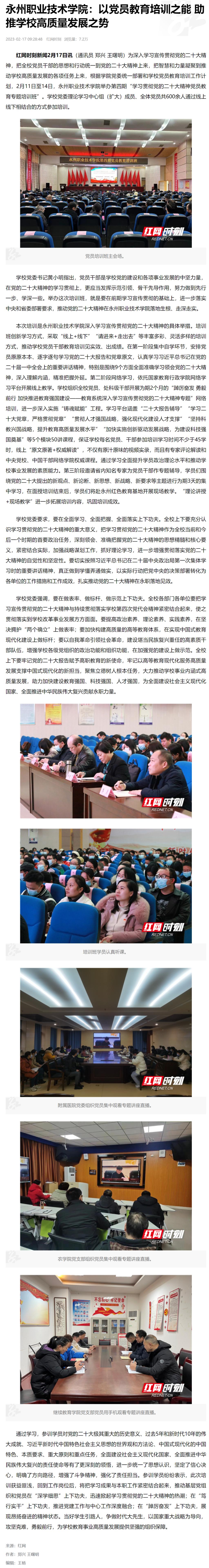 红网时刻新闻2月17日讯(通讯员 郑兴 王曙明)为深入学习宣传贯彻党的二十大精神,把全校党员干部的思想和行动统一到党的二十大精神上来,把智慧和力量凝聚到推动学校高质量发展的各项任务上来,根据学院党委统一部署和学校党员教育培训工作计划,2月11日至14日,永州职业技术学院举办第四期“学习贯彻党的二十大精神党员教育专题培训班”。学校党委理论学习中心组(扩大)成员、全体党员共600余人通过线上线下相结合的方式参加培训。