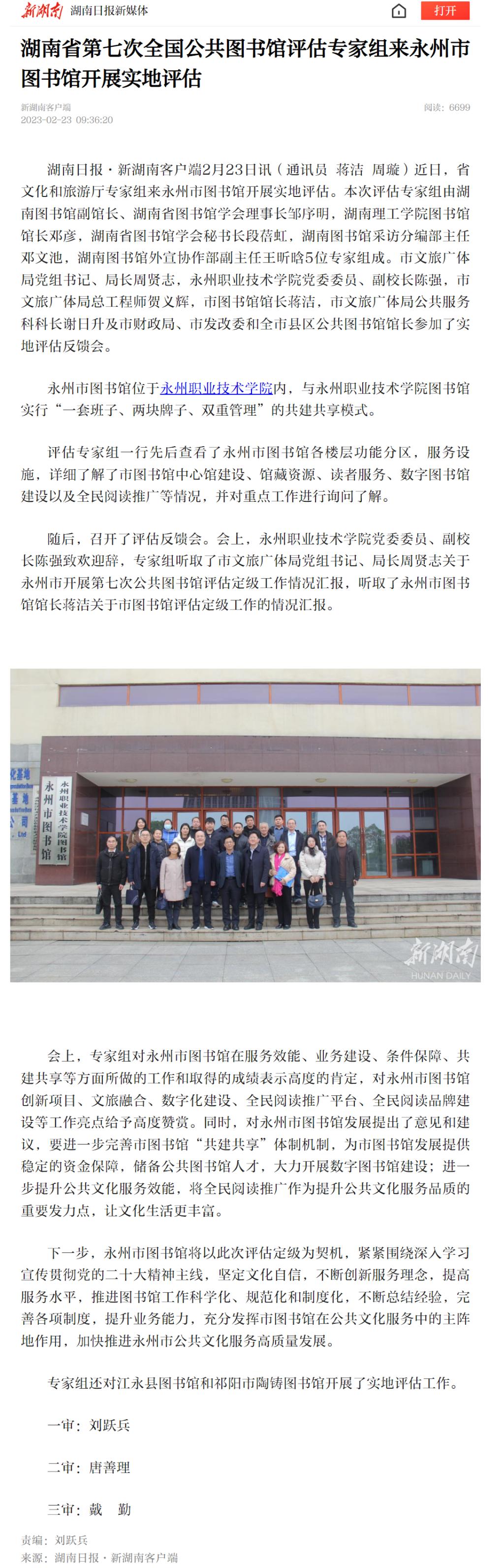 专家组还对江永县图书馆和祁阳市陶铸图书馆开展了实地评估工作。