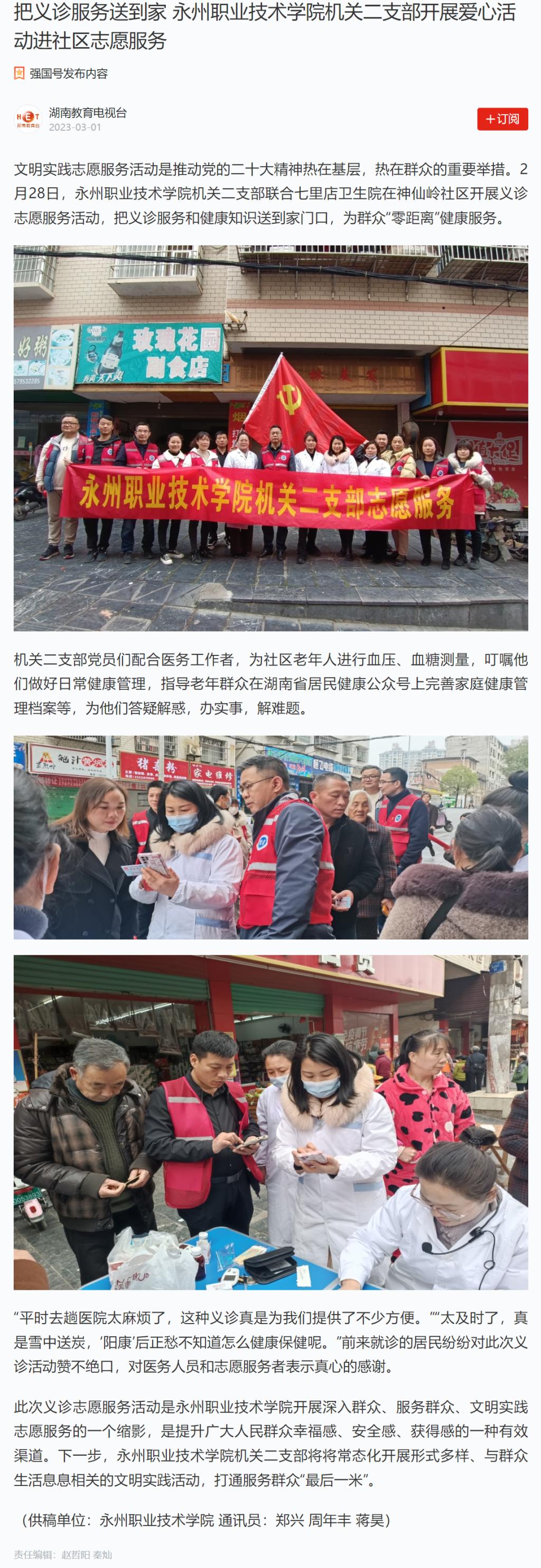 文明实践志愿服务活动是推动党的二十大精神热在基层,热在群众的重要举措。2月28日,永州职业技术学院机关二支部联合七里店卫生院在神仙岭社区开展义诊志愿服务活动,把义诊服务和健康知识送到家门口,为群众“零距离”健康服务。