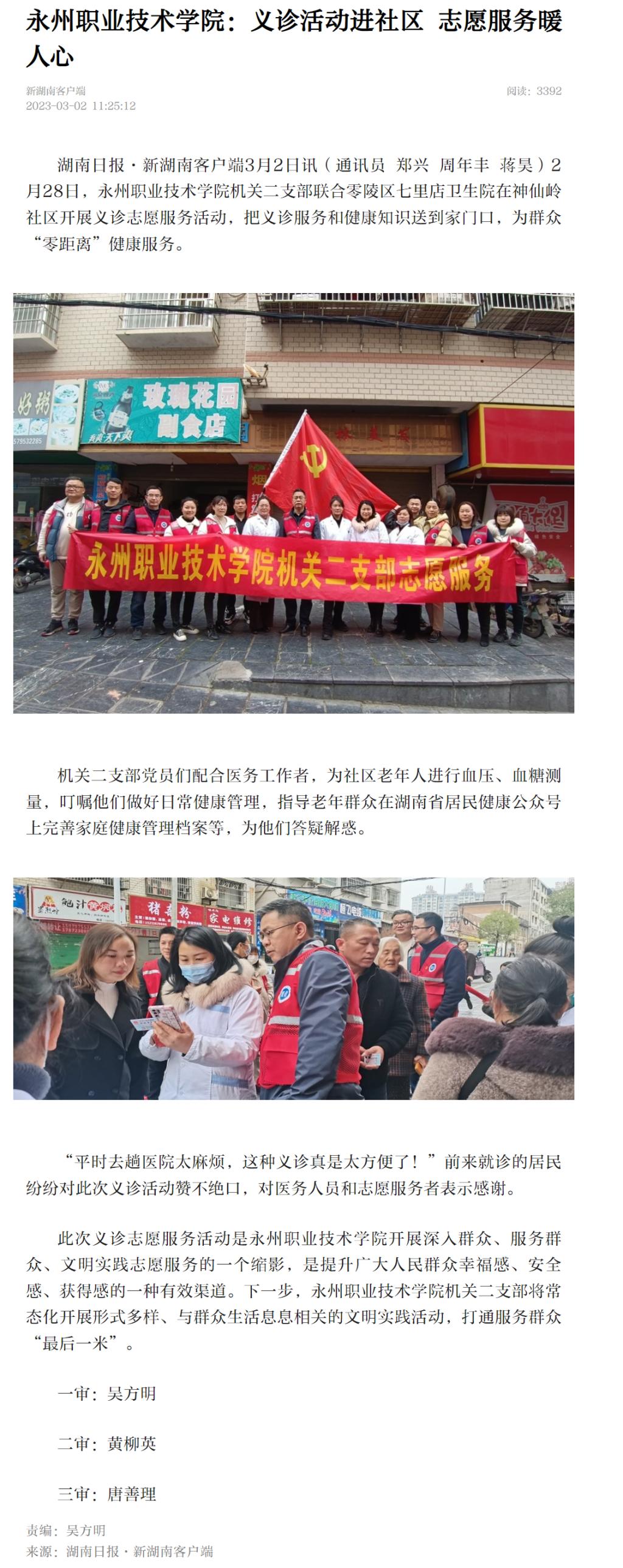 湖南日报·新湖南客户端3月2日讯(通讯员 郑兴 周年丰 蒋昊)2月28日,永州职业技术学院机关二支部联合零陵区七里店卫生院在神仙岭社区开展义诊志愿服务活动,把义诊服务和健康知识送到家门口,为群众“零距离”健康服务。