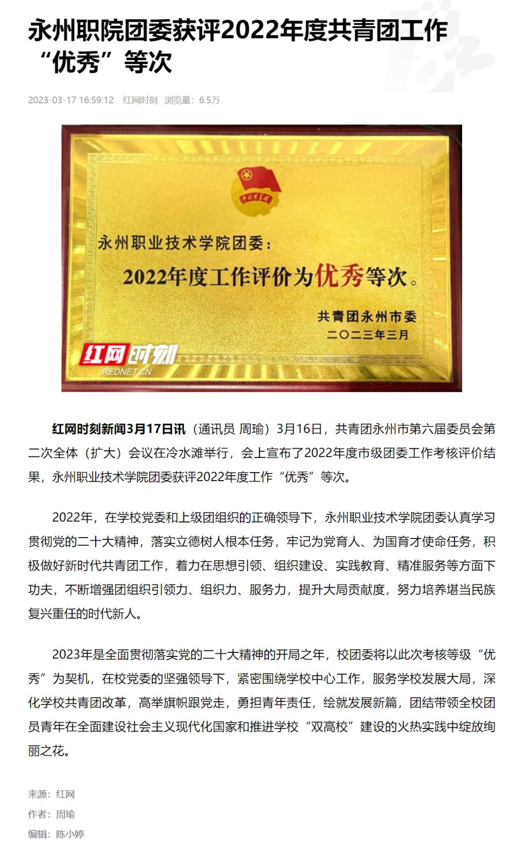 红网时刻新闻3月17日讯(通讯员 周瑜)3月16日,共青团永州市第六届委员会第二次全体(扩大)会议在冷水滩举行,会上宣布了2022年度市级团委工作考核评价结果,永州职业技术学院团委获评2022年度工作“优秀”等次。