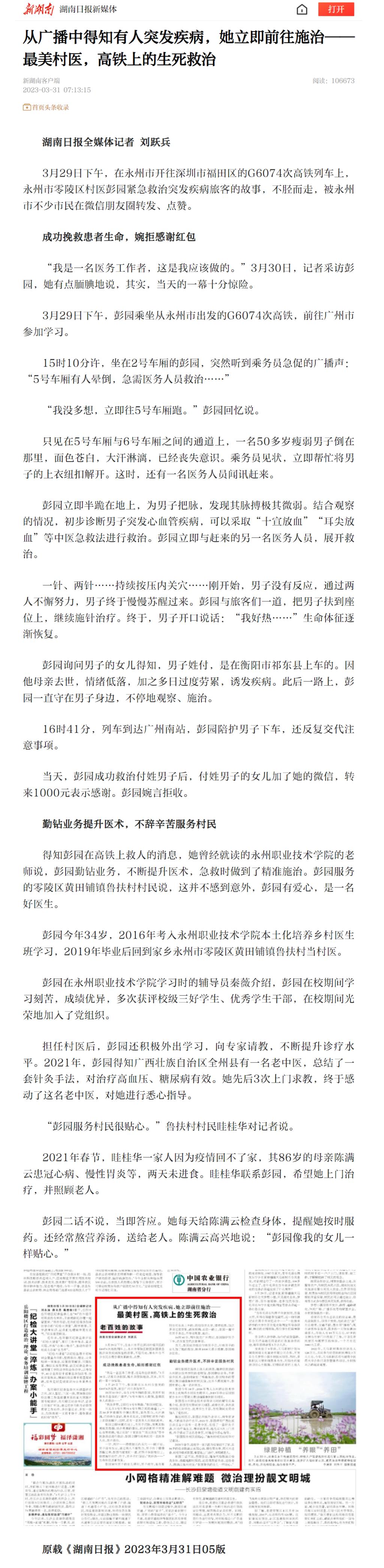 3月29日下午,在永州市开往深圳市福田区的G6074次高铁列车上,永州市零陵区村医彭园紧急救治突发疾病旅客的故事,不胫而走,被永州市不少市民在微信朋友圈转发、点赞。