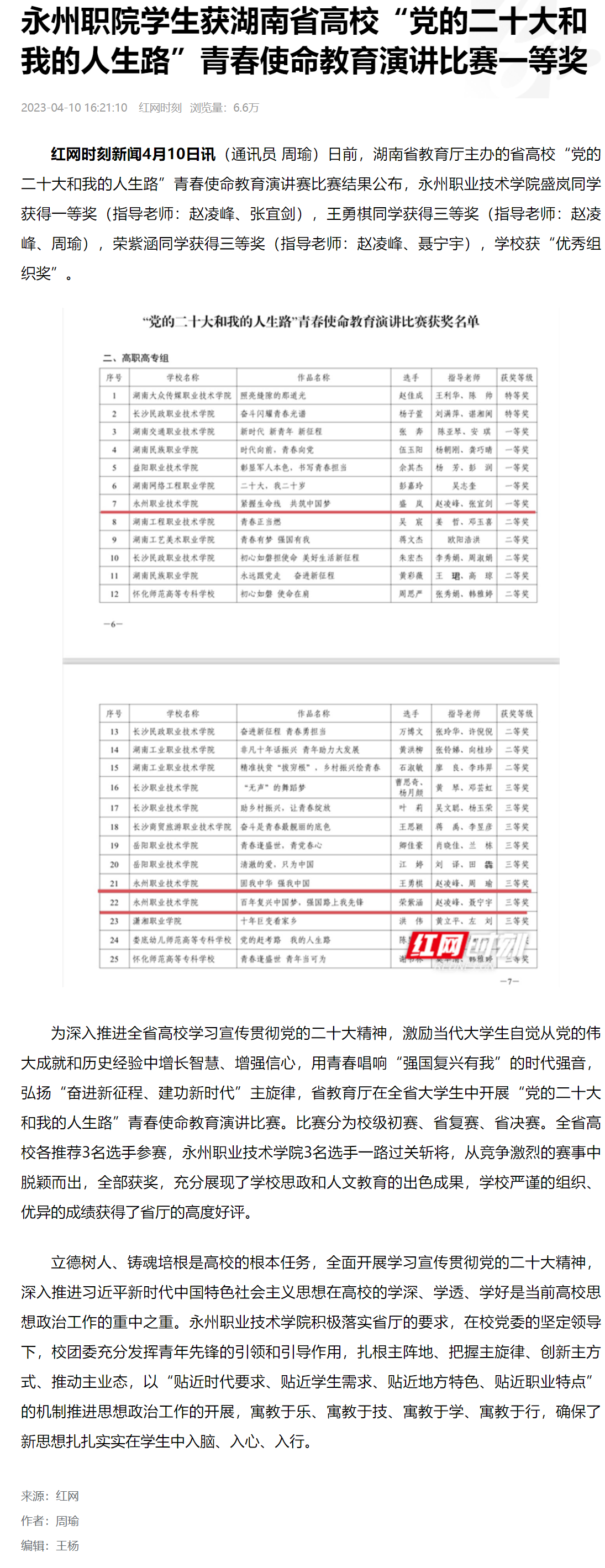 红网时刻新闻4月10日讯(通讯员 周瑜)日前,湖南省教育厅主办的省高校“党的二十大和我的人生路”青春使命教育演讲赛比赛结果公布,永州职业技术学院盛岚同学获得一等奖(指导老师:赵凌峰、张宜剑),王勇棋同学获得三等奖(指导老师:赵凌峰、周瑜),荣紫涵同学获得三等奖(指导老师:赵凌峰、聂宁宇),学校获“优秀组织奖”。