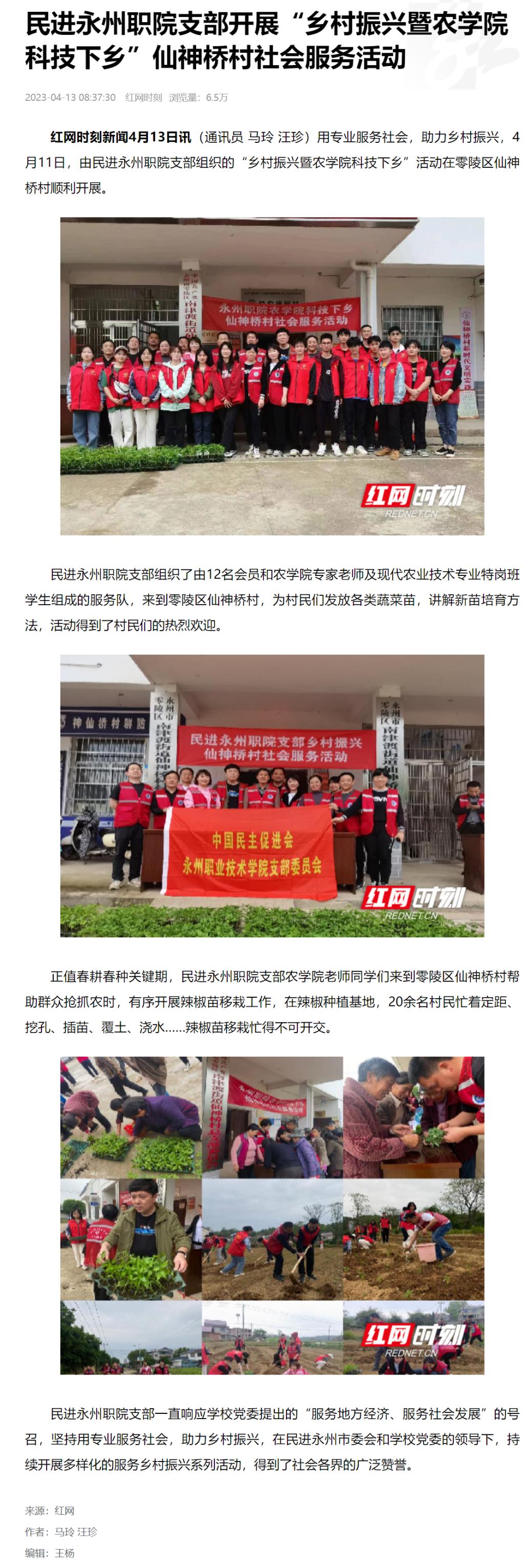 民进永州职院支部一直响应学校党委提出的“服务地方经济、服务社会发展”的号召,坚持用专业服务社会,助力乡村振兴,在民进永州市委会和学校党委的领导下,持续开展多样化的服务乡村振兴系列活动,得到了社会各界的广泛赞誉。
