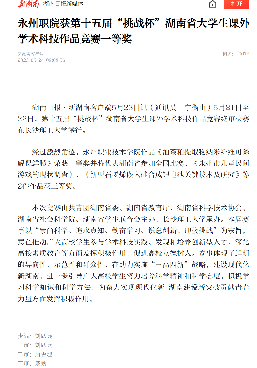 经过激烈角逐,永州职业技术学院作品《油茶粕提取物纳米纤维可降解保鲜膜》荣获一等奖并将代表湖南省参加全国比赛、《永州市儿童民间游戏的现状调查》、《新型石墨烯嵌入硅合成锂电池关键技术及研究》等2件作品获三等奖。