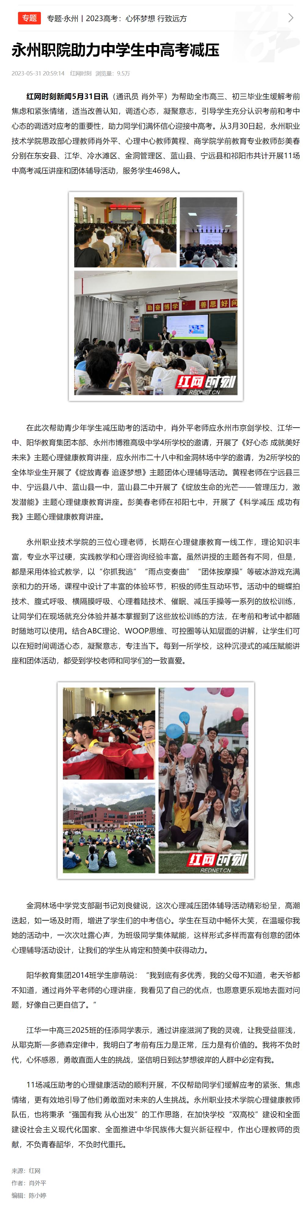 红网时刻新闻5月31日讯(通讯员 肖外平)为帮助全市高三、初三毕业生缓解考前焦虑和紧张情绪,适当改善认知,调适心态,凝聚意志,引导学生充分认识考前和考中心态的调适对应考的重要性,助力同学们满怀信心迎接中高考。从3月30日起,永州职业技术学院思政部心理教师肖外平、心理中心教师黄程、商学院学前教育专业教师彭美春分别在东安县、江华、冷水滩区、金洞管理区、蓝山县、宁远县和祁阳市共计开展11场中高考减压讲座和团体辅导活动,服务学生4698人。在此次帮助青少年学生减压助考的活动中,肖外平老师应永州市京剑学校、江华一中、阳华教育集团本部、永州市博雅高级中学4所学校的邀请,开展了《好心态 成就美好未来》主题心理健康教育讲座,应永州市二十八中和金洞林场中学的邀请,为2所学校的全体毕业生开展了《绽放青春 追逐梦想》主题团体心理辅导活动。黄程老师在宁远县三中、宁远县八中、蓝山县一中,蓝山县二中开展了《绽放生命的光芒——管理压力,激发潜能》主题心理健康教育讲座。彭美春老师在祁阳七中,开展了《科学减压 成功有我》主题心理健康教育讲座。