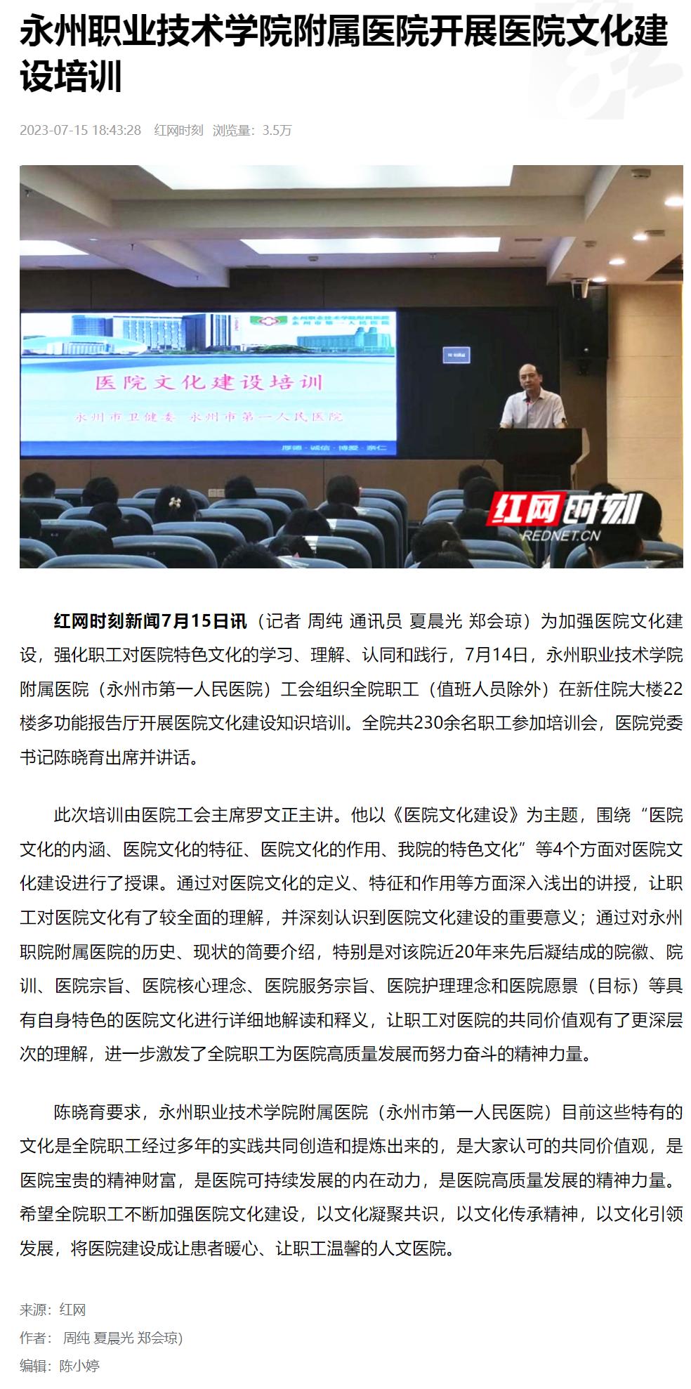 红网时刻新闻7月15日讯(记者 周纯 通讯员 夏晨光 郑会琼)为加强医院文化建设,强化职工对医院特色文化的学习、理解、认同和践行,7月14日,永州职业技术学院附属医院(永州市第一人民医院)工会组织全院职工(值班人员除外)在新住院大楼22楼多功能报告厅开展医院文化建设知识培训。全院共230余名职工参加培训会,医院党委书记陈晓育出席并讲话。