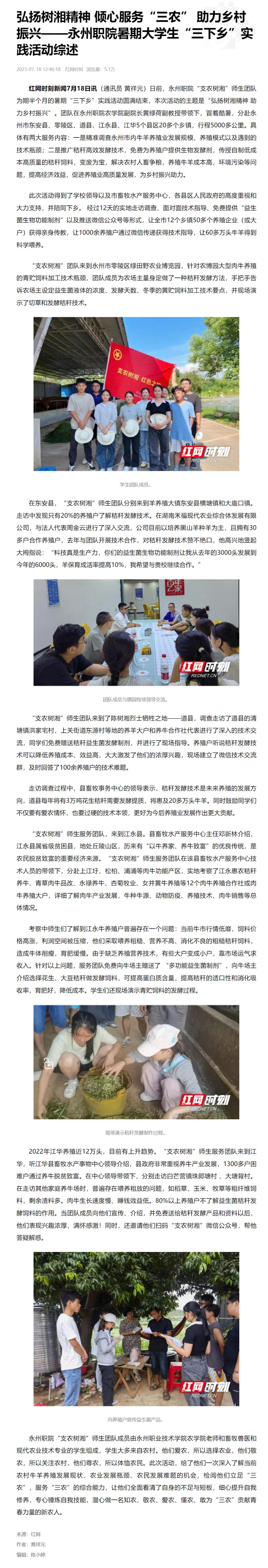 红网时刻新闻7月18日讯(通讯员 黄祥元)日前,永州职院“支农树湘”师生团队为期半个月的暑期“三下乡”实践活动圆满结束,本次活动的主题是“弘扬树湘精神 助力乡村振兴”。团队在永州职院农学院副院长黄绿荷副教授带领下,冒着酷暑,分赴永州市东安县、零陵区、道县、江永县、江华5个县区20多个乡镇,行程5000多公里。具体有两大服务内容:一是精准调查永州市内牛羊养殖业发展规模、养殖模式以及遇到的技术瓶颈;二是推广秸秆高效发酵技术,免费为养殖户提供生物发酵剂,传授自制低成本高质量的秸秆饲料,变废为宝,解决农村人畜争粮,养殖牛羊成本高,环境污染等问题,提高经济效益,促进养殖业高质量发展,为乡村振兴助力。