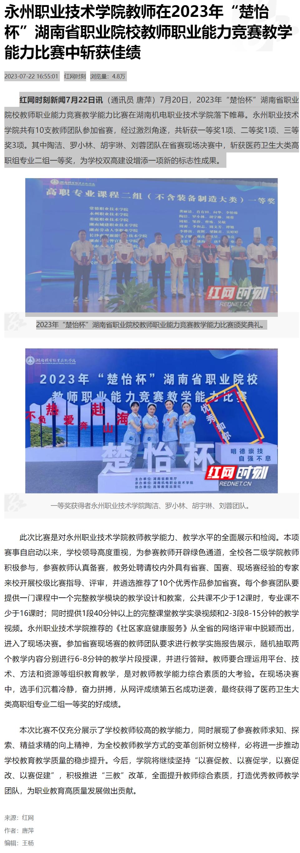 红网时刻新闻7月22日讯(通讯员 唐萍)7月20日,2023年“楚怡杯”湖南省职业院校教师职业能力竞赛教学能力比赛在湖南机电职业技术学院落下帷幕。永州职业技术学院共有10支教师团队参加省赛,经过激烈角逐,共斩获一等奖1项、二等奖1项、三等奖3项。其中陶洁、罗小林、胡宇琳、刘蓉团队在省赛现场决赛中,斩获医药卫生大类高职组专业二组一等奖,为学校双高建设增添一项新的标志性成果。