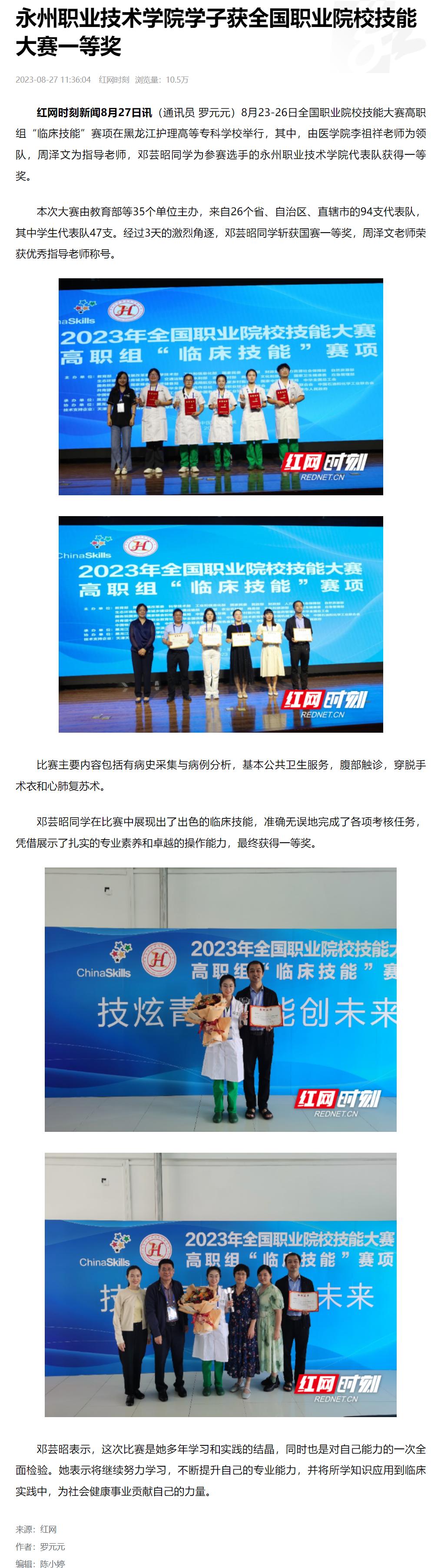 红网时刻新闻8月27日讯(通讯员 罗元元)8月23-26日全国职业院校技能大赛高职组“临床技能”赛项在黑龙江护理高等专科学校举行,其中,由医学院李祖祥老师为领队,周泽文为指导老师,邓芸昭同学为参赛选手的永州职业技术学院代表队获得一等奖。