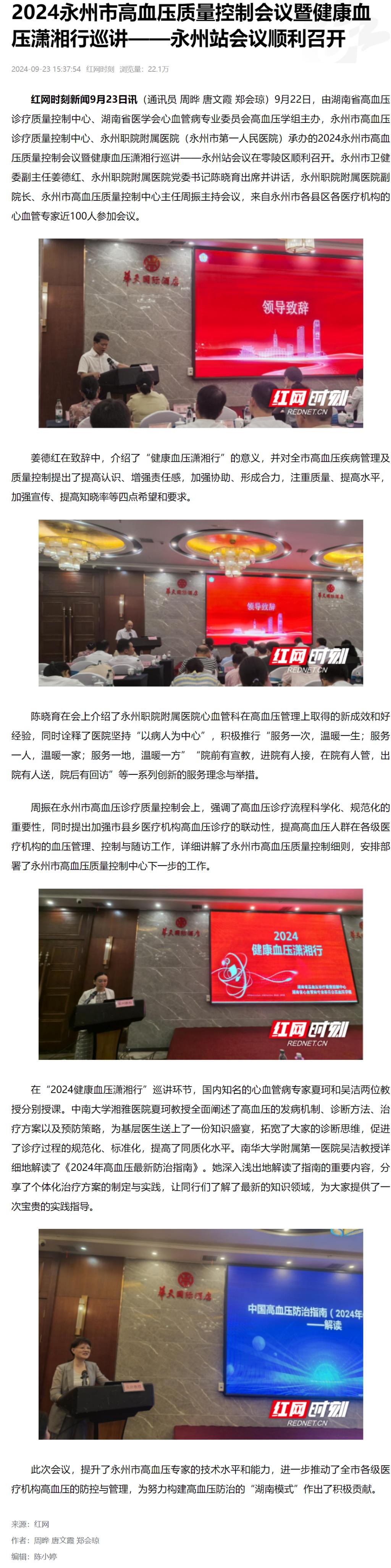 红网时刻新闻9月23日讯(通讯员 周晔 唐文霞 郑会琼)9月22日,由湖南省高血压诊疗质量控制中心、湖南省医学会心血管病专业委员会高血压学组主办,永州市高血压诊疗质量控制中心、永州职院附属医院(永州市第一人民医院)承办的2024永州市高血压质量控制会议暨健康血压潇湘行巡讲——永州站会议在零陵区顺利召开。永州市卫健委副主任姜德红、永州职院附属医院党委书记陈晓育出席并讲话,永州职院附属医院副院长、永州市高血压质量控制中心主任周振主持会议,来自永州市各县区各医疗机构的心血管专家近100人参加会议。