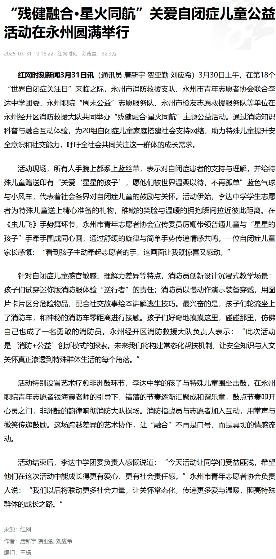 红网时刻新闻3月31日讯(通讯员 唐新宇 贺亚勤 刘应希)3月30日上午,在第18个“世界自闭症关注日”来临之际,永州市消防救援支队、永州市青年志愿者协会联合李达中学团委、永州职院“周末公益”志愿服务队、永州市橙友志愿救援服务队等单位在永州经开区消防救援大队共同举办“残健融合·星火同航”主题公益活动。通过消防知识科普与融合互动体验,为20组自闭症儿童家庭搭建社会支持网络,助力特殊儿童提升安全意识和社交能力,呼吁全社会共同关注这一群体的成长需求。