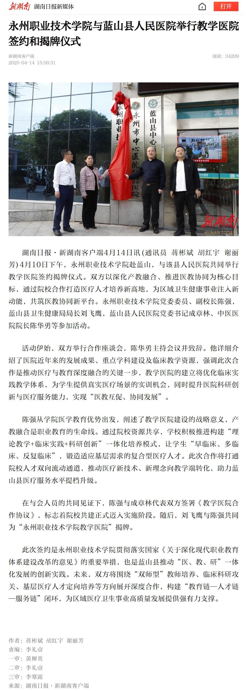 湖南日报·新湖南客户端4月14日讯(通讯员 蒋彬斌 胡红宇 谢丽芳)4月10日下午,永州职业技术学院赴蓝山,与该县人民医院共同举行教学医院签约揭牌仪式。双方以深化产教融合、推进医教协同为核心目标,通过院校合作打造医疗人才培养新高地,为区域卫生健康事业注入新动能,共筑医教协同新平台。永州职业技术学院党委委员、副校长陈强,蓝山县卫生健康局局长刘飞鹰,蓝山县人民医院党委书记成章林、中医医院院长陈华勇等参加活动。