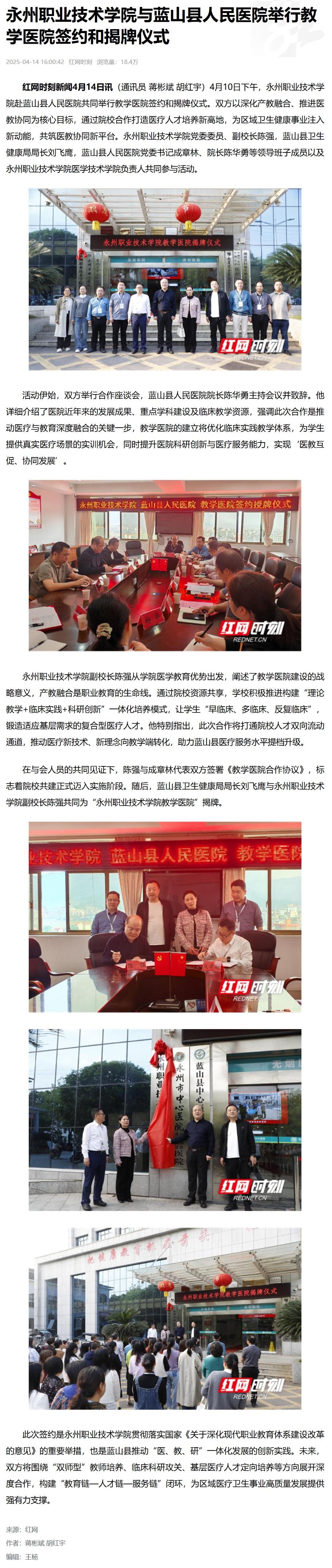 此次签约是永州职业技术学院贯彻落实国家《关于深化现代职业教育体系建设改革的意见》的重要举措,也是蓝山县推动“医、教、研”一体化发展的创新实践。未来,双方将围绕“双师型”教师培养、临床科研攻关、基层医疗人才定向培养等方向展开深度合作,构建“教育链—人才链—服务链”闭环,为区域医疗卫生事业高质量发展提供强有力支撑。