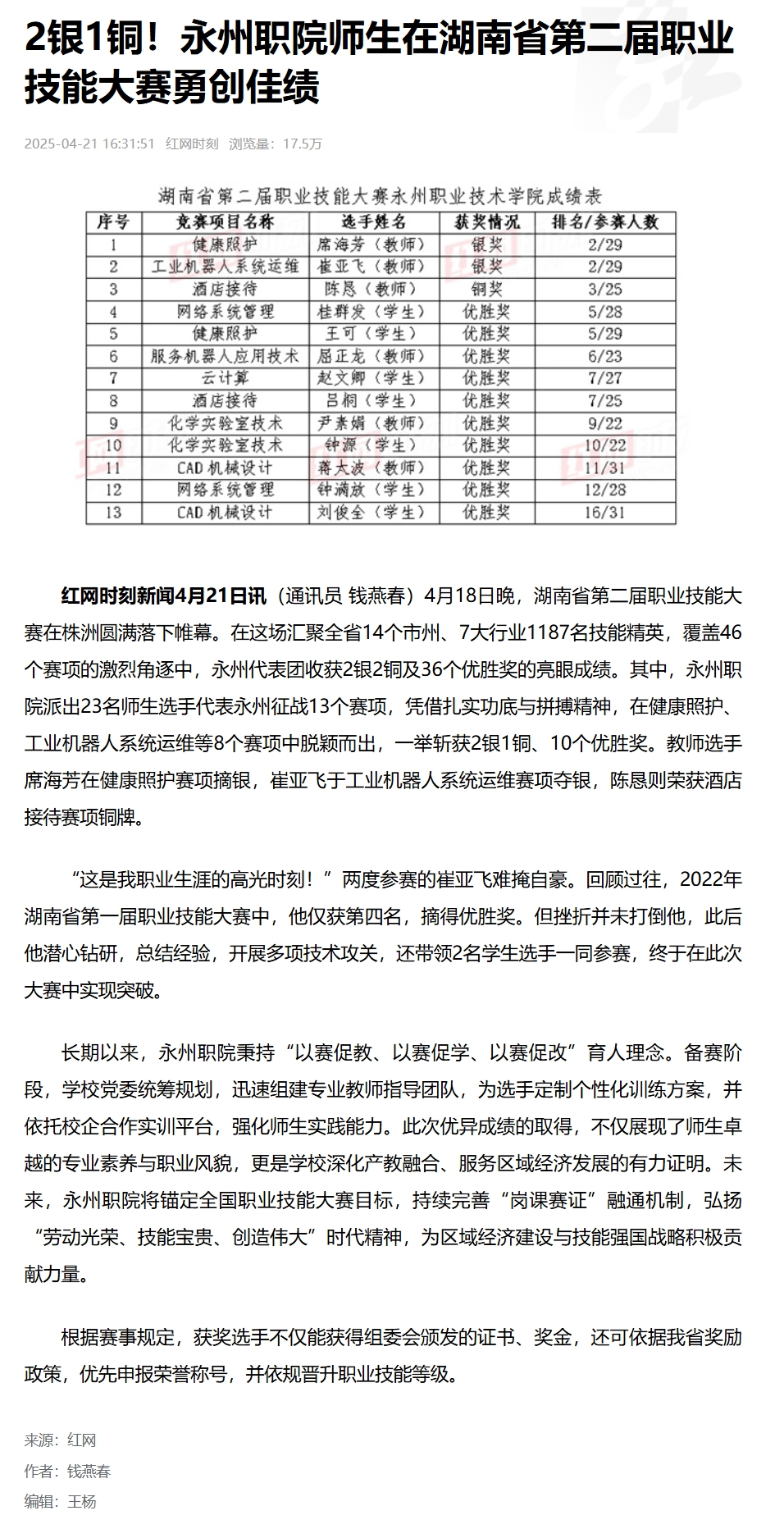 长期以来,永州职院秉持“以赛促教、以赛促学、以赛促改”育人理念。备赛阶段,学校党委统筹规划,迅速组建专业教师指导团队,为选手定制个性化训练方案,并依托校企合作实训平台,强化师生实践能力。此次优异成绩的取得,不仅展现了师生卓越的专业素养与职业风貌,更是学校深化产教融合、服务区域经济发展的有力证明。未来,永州职院将锚定全国职业技能大赛目标,持续完善“岗课赛证”融通机制,弘扬“劳动光荣、技能宝贵、创造伟大”时代精神,为区域经济建设与技能强国战略积极贡献力量。