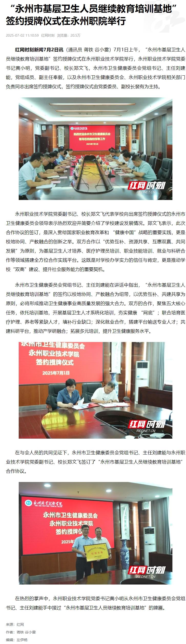 永州市卫生健康委员会党组书记、主任刘建能在讲话中指出,“永州市基层卫生人员继续教育培训基地”的签约以校地协同、产教融合为纽带,以优势互补、共建共享为原则,必将形成推动卫生健康事业高质量发展的强大合力。双方的合作,聚焦五大核心任务,依托培训基地,开展基层卫生人才系统化培训,夯实健康 “网底”;联合培育医疗护理、养老等紧缺人才,填补行业缺口;深化就业合作,搭建平台输送专业人才;共建科研平台,推动产学研融合;拓展多元培训,提升卫生健康服务水平。