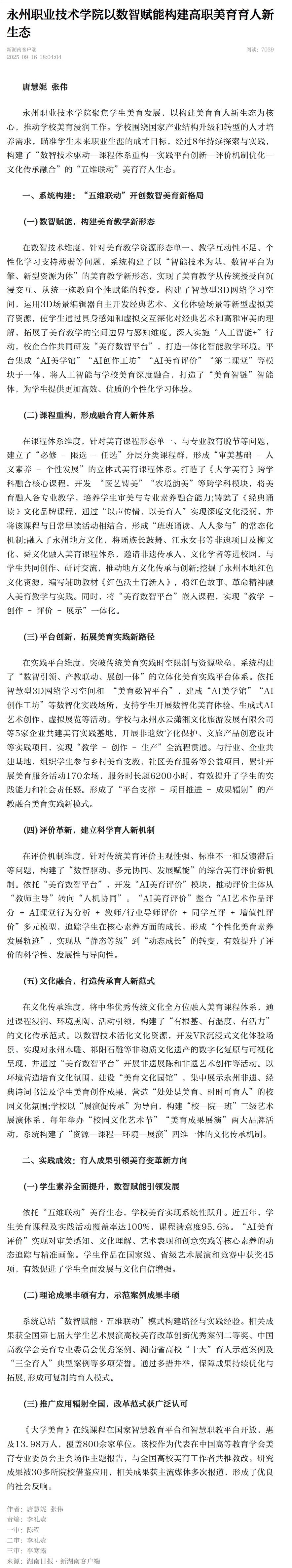 永州职业技术学院聚焦学生美育发展,以构建美育育人新生态为核心,推动学校美育浸润工作。学校围绕国家产业结构升级和转型的人才培养需求,瞄准学生未来职业生涯的成才目标,经过8年持续探索与实践,构建了“数智技术驱动—课程体系重构—实践平台创新—评价机制优化—文化传承融合”的“五维联动”美育育人生态。