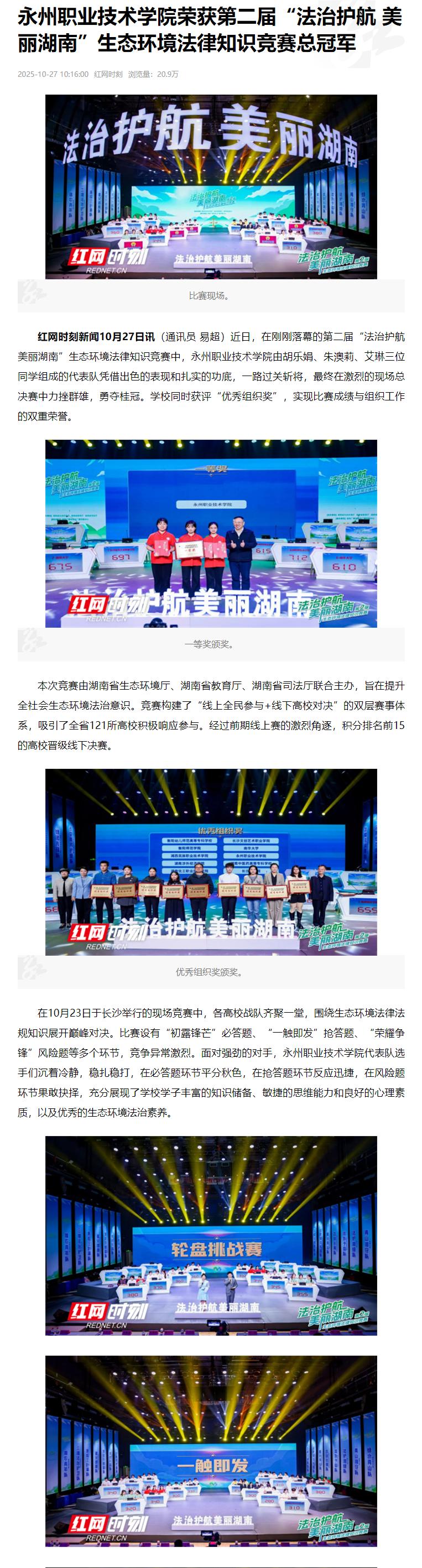 红网时刻新闻10月27日讯(通讯员 易超)近日,在刚刚落幕的第二届“法治护航 美丽湖南”生态环境法律知识竞赛中,永州职业技术学院由胡乐娟、朱澳莉、艾琳三位同学组成的代表队凭借出色的表现和扎实的功底,一路过关斩将,最终在激烈的现场总决赛中力挫群雄,勇夺桂冠。学校同时获评“优秀组织奖”,实现比赛成绩与组织工作的双重荣誉。