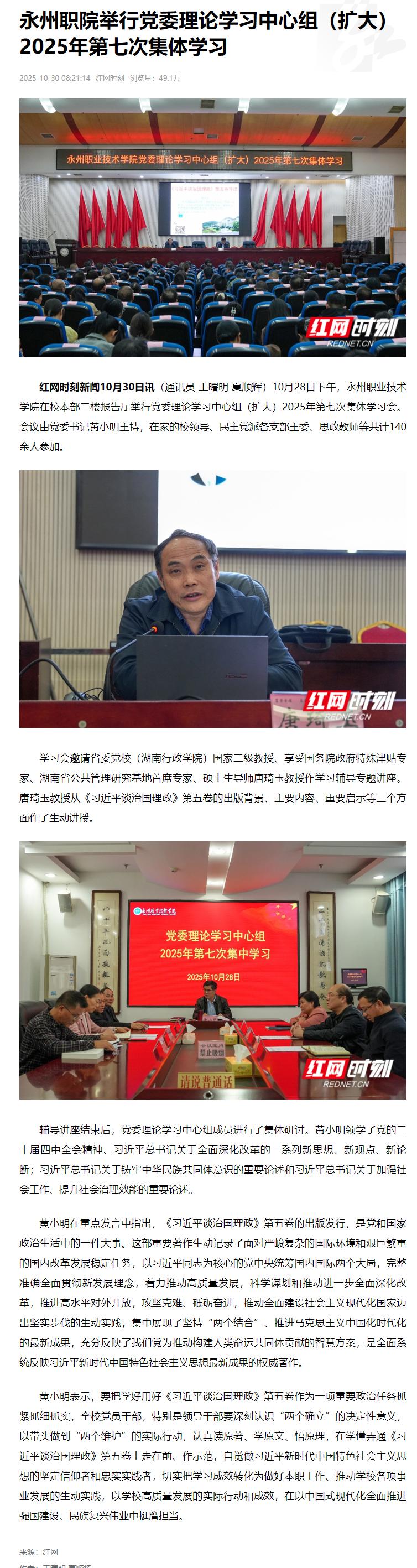 红网时刻新闻10月30日讯(通讯员 王曙明 夏顺辉)10月28日下午,永州职业技术学院在校本部二楼报告厅举行党委理论学习中心组(扩大)2025年第七次集体学习会。会议由党委书记黄小明主持,在家的校领导、民主党派各支部主委、思政教师等共计140余人参加。