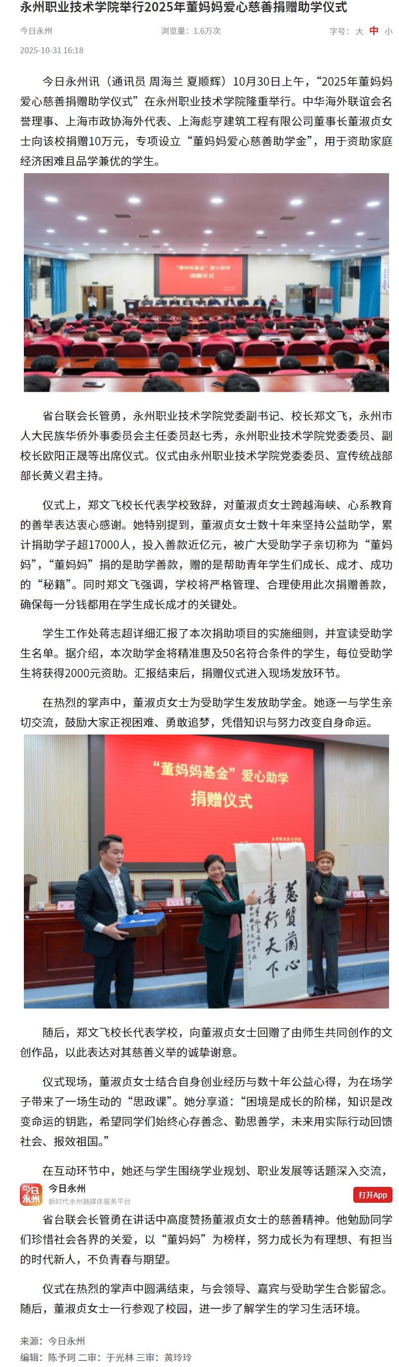 今日永州讯(通讯员 周海兰 夏顺辉)10月30日上午,“2025年董妈妈爱心慈善捐赠助学仪式”在永州职业技术学院隆重举行。中华海外联谊会名誉理事、上海市政协海外代表、上海彪亨建筑工程有限公司董事长董淑贞女士向该校捐赠10万元,专项设立“董妈妈爱心慈善助学金”,用于资助家庭经济困难且品学兼优的学生。