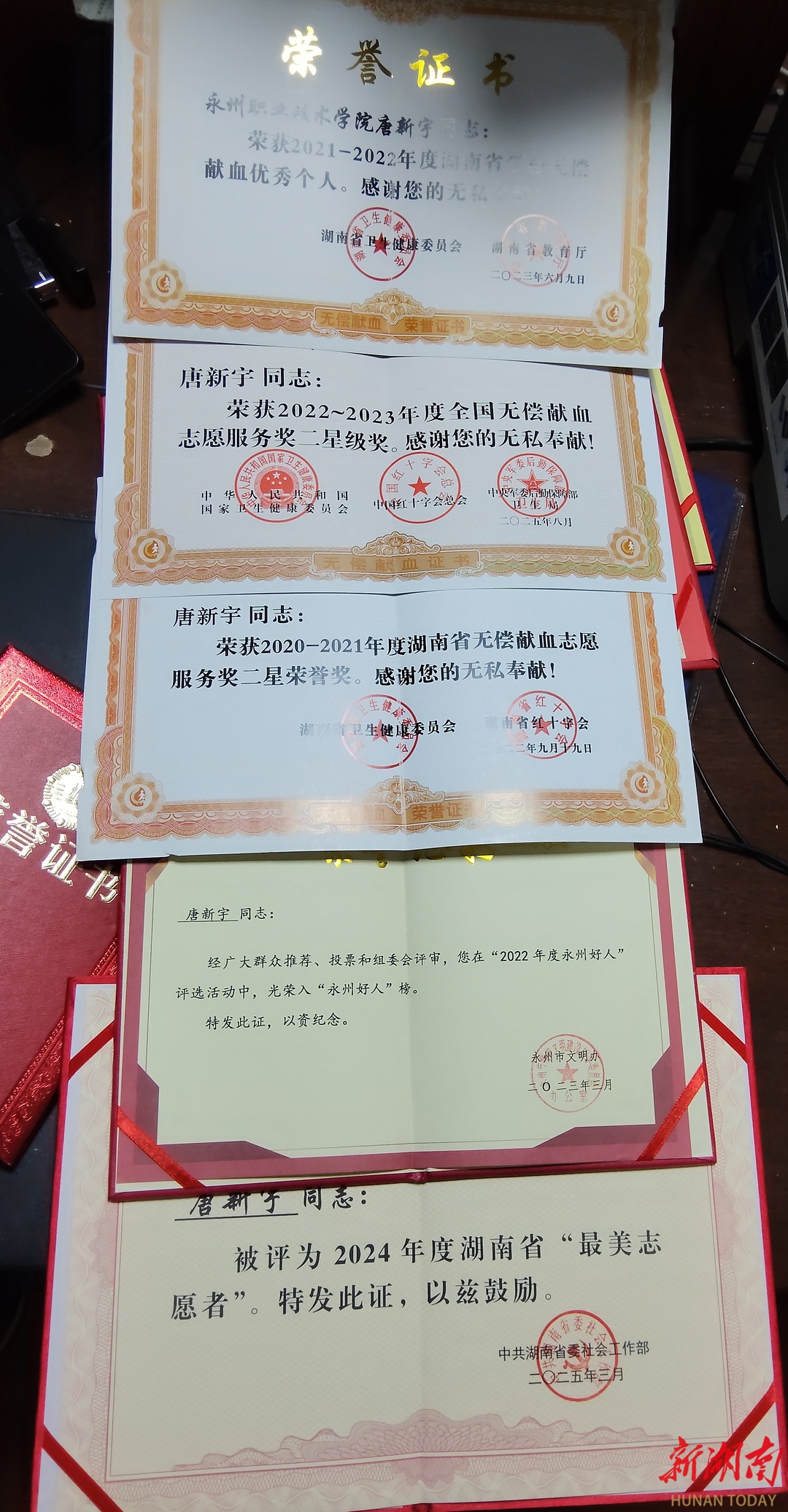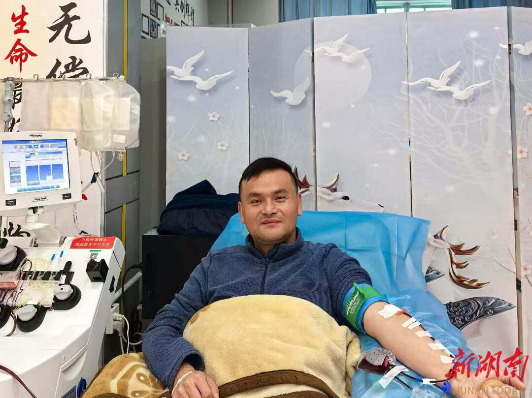 今年46岁的唐新宇自愿献血37次,总献血量10800毫升,获评“2022—2023年度全国无偿献血志愿服务奖二星级奖”“2024年度湖南省‘最美志愿者’”等。他说:“我是一名普通人,愿做平凡小事,发一束微光。”