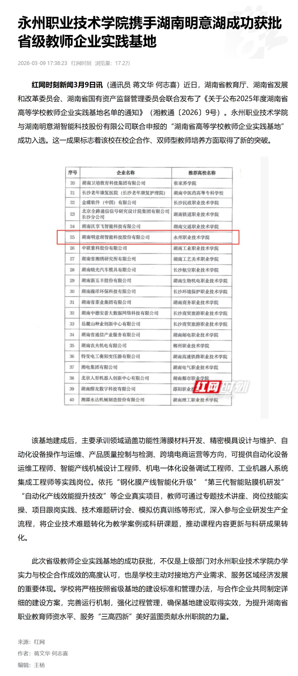 红网时刻新闻3月9日讯(通讯员 蒋文华 何志喜)近日,湖南省教育厅、湖南省发展和改革委员会、湖南省国有资产监督管理委员会联合发布了《关于公布2025年度湖南省高等学校教师企业实践基地名单的通知》(湘教通〔2026〕9号)。永州职业技术学院与湖南明意湖智能科技股份有限公司联合申报的“湖南省高等学校教师企业实践基地”成功入选。这一成果标志着该校在校企合作、双师型教师培养方面取得了新的突破。