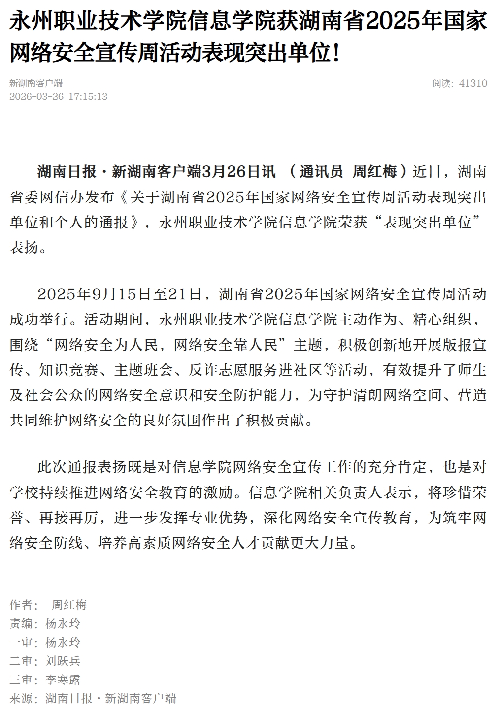 湖南日报·新湖南客户端3月26日讯(通讯员周红梅)近日,湖南省委网信办发布《关于湖南省2025年国家网络安全宣传周活动表现突出单位和个人的通报》,永州职业技术学院信息学院荣获“表现突出单位”表扬。
