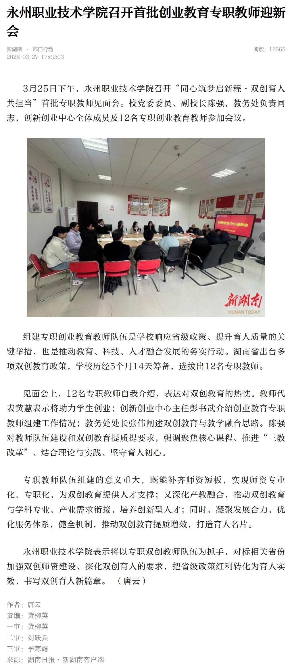 永州职业技术学院表示将以专职双创教师队伍为抓手,对标相关省份加强双创师资建设、深化双创育人的要求,把省级政策红利转化为育人实效,书写双创育人新篇章。 (唐云)