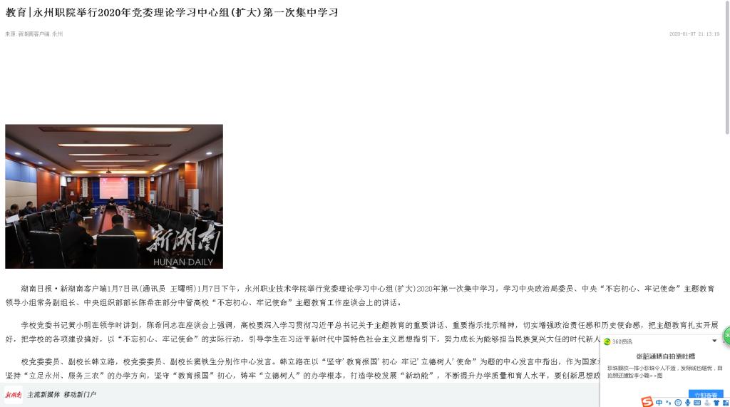 湖南日报·新湖南客户端1月7日讯(通讯员 王曙明)1月7日下午,永州职业技术学院举行党委理论学习中心组(扩大)2020年第一次集中学习,学习中央政治局委员、中央“不忘初心、牢记使命”主题教育领导小组常务副组长、中央组织部部长陈希在部分中管高校“不忘初心、牢记使命”主题教育工作座谈会上的讲话。