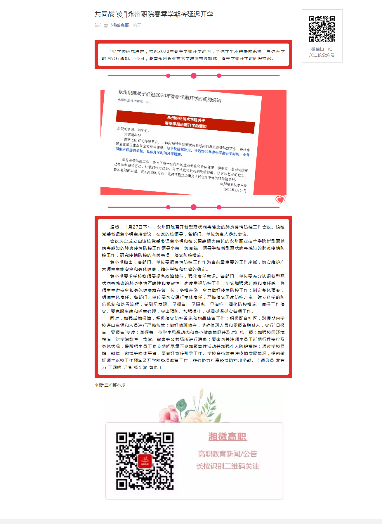上一条:【三湘都市报】共同战“疫”|永州职院春季学期将延迟开学