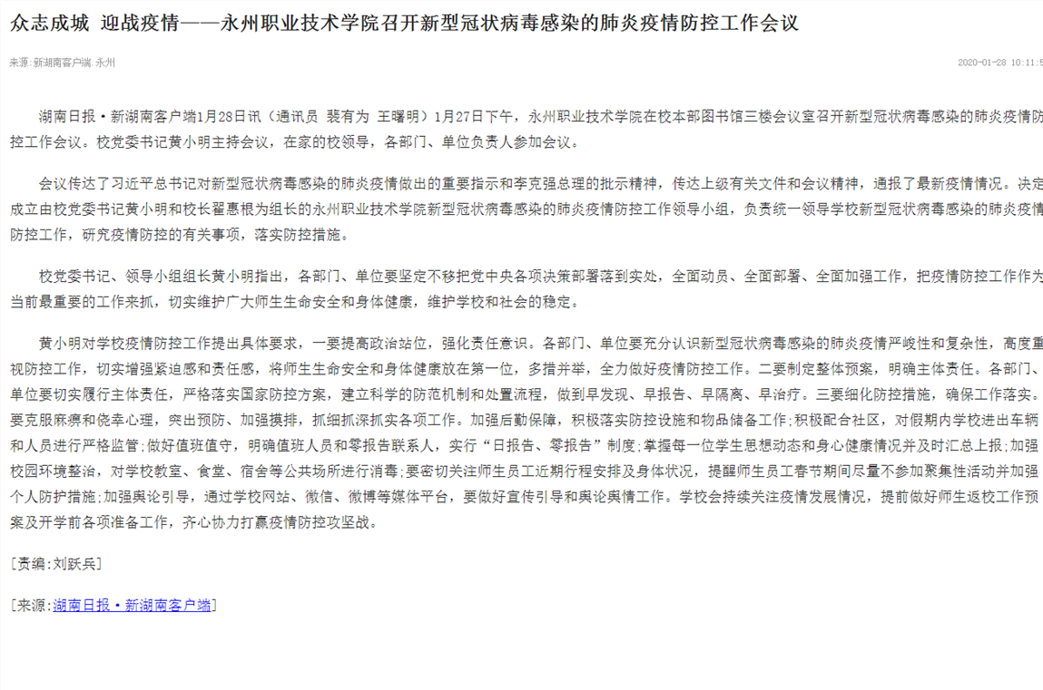 湖南日报·新湖南客户端1月28日讯(通讯员裴有为王曙明)1月27日下午,永州职业技术学院在校本部图书馆三楼会议室召开新型冠状病毒感染的肺炎疫情防控工作会议。校党委书记黄小明主持会议,在家的校领导,各部门、单位负责人参加会议。