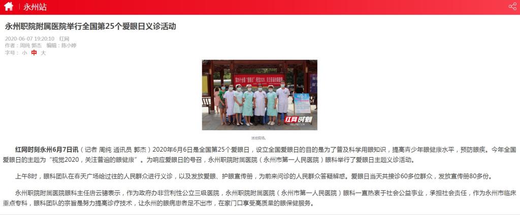 红网时刻永州6月7日讯(记者 周纯 通讯员 郭杰)2020年6月6日是全国第25个爱眼日,设立全国爱眼日的目的是为了普及科学用眼知识,提高青少年眼健康水平,预防眼疾。今年全国爱眼日的主题为“视觉2020,关注普遍的眼健康”。为响应爱眼日的号召,永州职院附属医院(永州市第一人民医院)眼科举行了爱眼日主题义诊活动。
