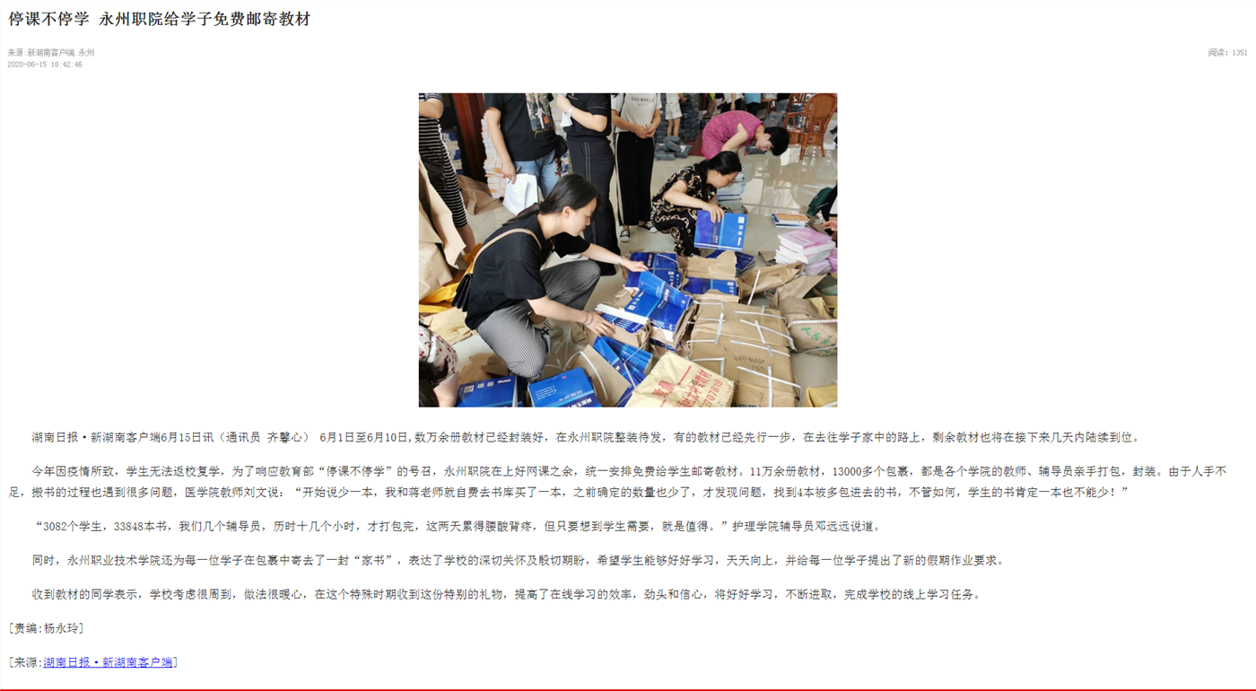 湖南日报·新湖南客户端6月15日讯(通讯员 齐馨心) 6月1日至6月10日,数万余册教材已经封装好,在永州职院整装待发,有的教材已经先行一步,在去往学子家中的路上,剩余教材也将在接下来几天内陆续到位。