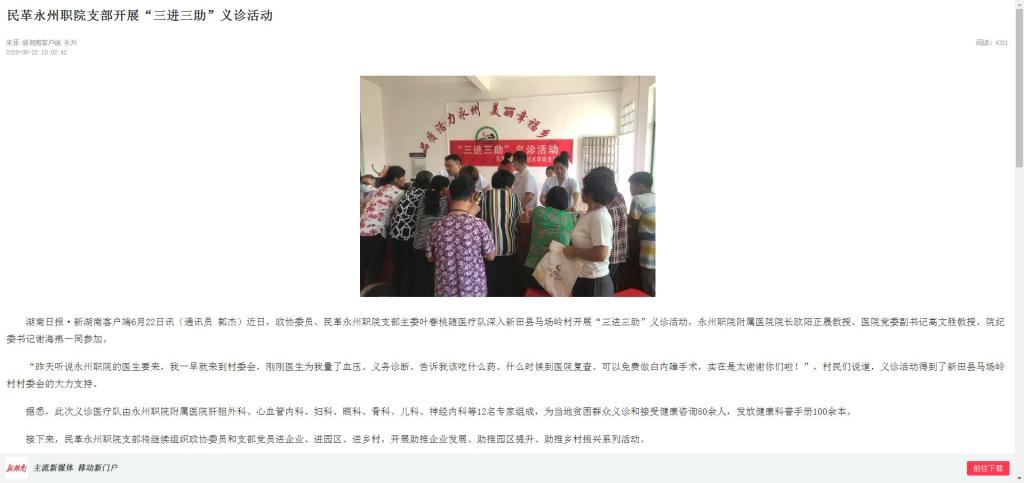 湖南日报·新湖南客户端6月22日讯(通讯员 郭杰)近日,政协委员、民革永州职院支部主委叶春桃随医疗队深入新田县马场岭村开展“三进三助”义诊活动,永州职院附属医院院长欧阳正晟教授、医院党委副书记高文胜教授、院纪委书记谢海燕一同参加。