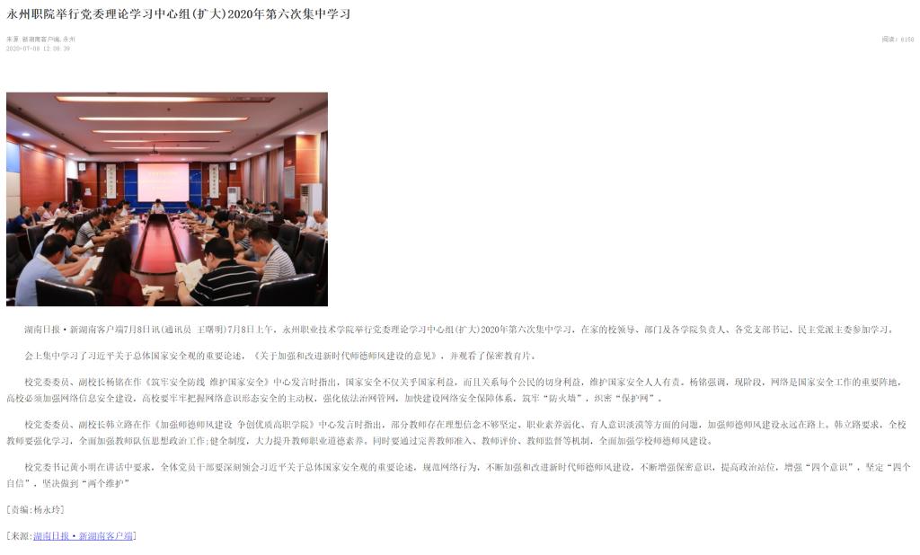 湖南日报·新湖南客户端7月8日讯(通讯员 王曙明)7月8日上午,永州职业技术学院举行党委理论学习中心组(扩大)2020年第六次集中学习,在家的校领导、部门及各学院负责人、各党支部书记、民主党派主委参加学习。