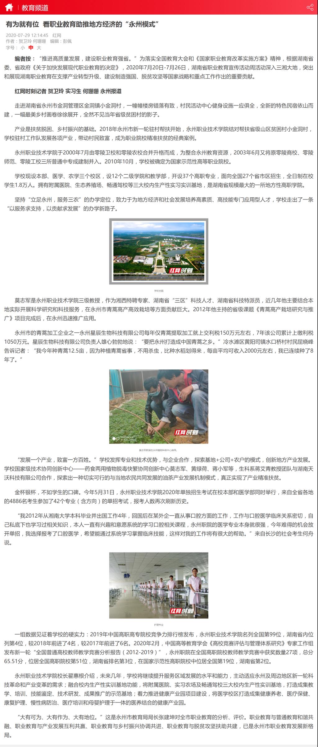 编者按:“推进高质量发展,建设职业教育强省。”为落实全国教育大会和《国家职业教育改革实施方案》精神,根据湖南省委、省政府《关于加快发展现代职业教育的决定》,2020年7月20日-7月26日,湖南省职业教育宣传活动周活动深入三湘大地,突出和展现湖南职业教育在支撑产业转型升级、建设制造强国、脱贫攻坚等国家战略和重点工作作出的重要贡献。